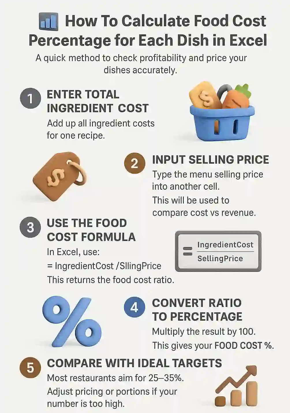 By the end, you'll understand how to calculate food cost percentage step-by-step, build an Excel layout that updates automatically, and use your numbers to make smarter pricing and purchasing decisions.